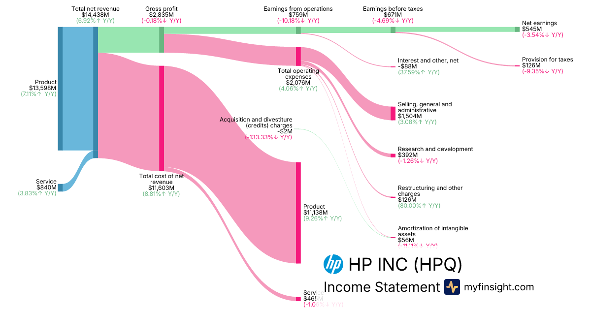 For the quarter ending 2026-01-31, HPQ made $14,438M in revenue. $545M in net income. Net profit margin of 3.77%.
