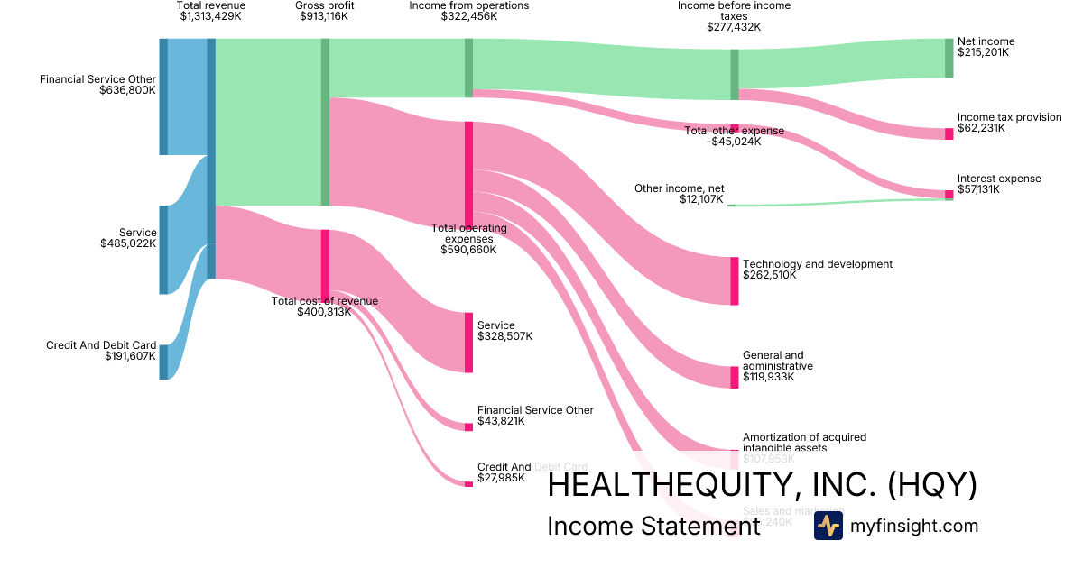 For the year ending 2026-01-31, HQY made $1,313,429K in revenue. $215,201K in net income. Net profit margin of 16.38%.