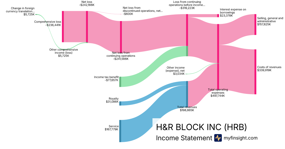 For the quarter ending 2025-12-31, HRB made $198,865K in revenue. -$236,441K in net income. Net profit margin of -118.90%.