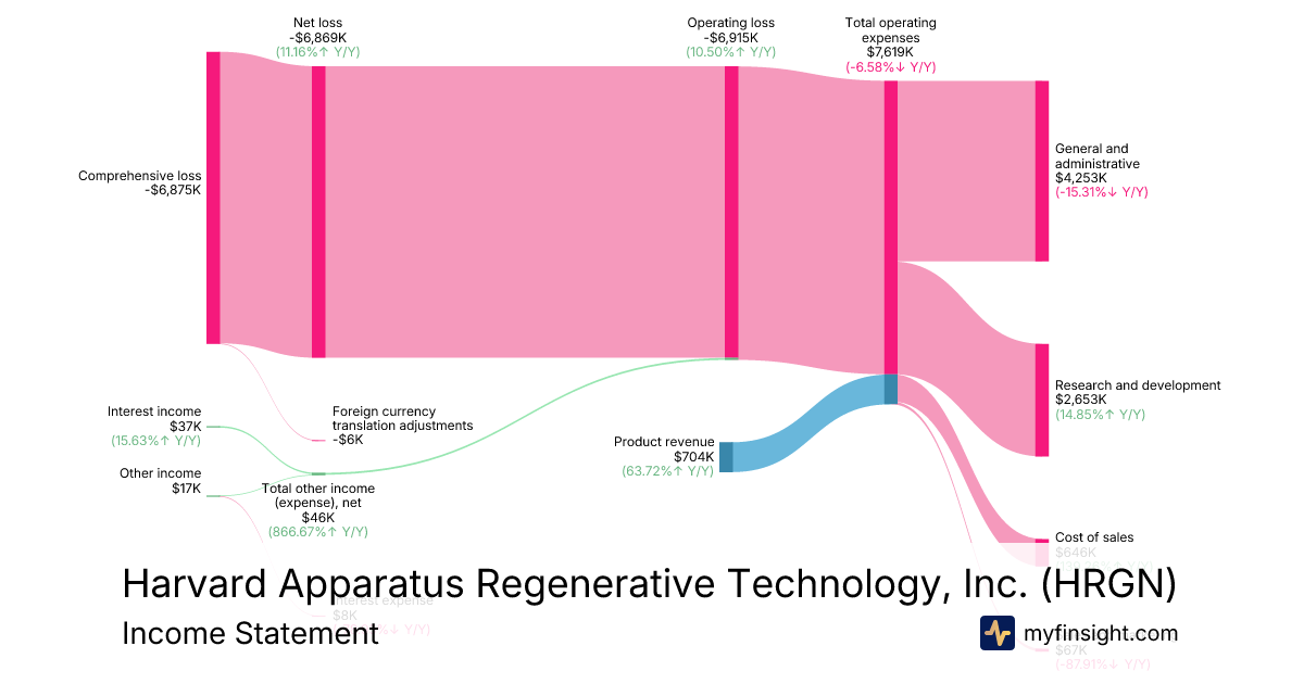 For the year ending 2025-12-31, HRGN made $704K in revenue. -$6,875K in net income. Net profit margin of -976.56%.