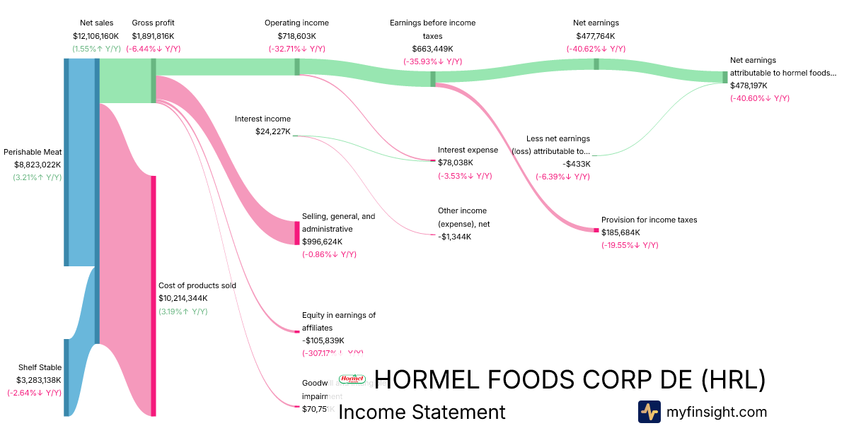 For the year ending 2025-10-26, HRL made $12,106,160K in revenue. $478,197K in net income. Net profit margin of 3.95%.