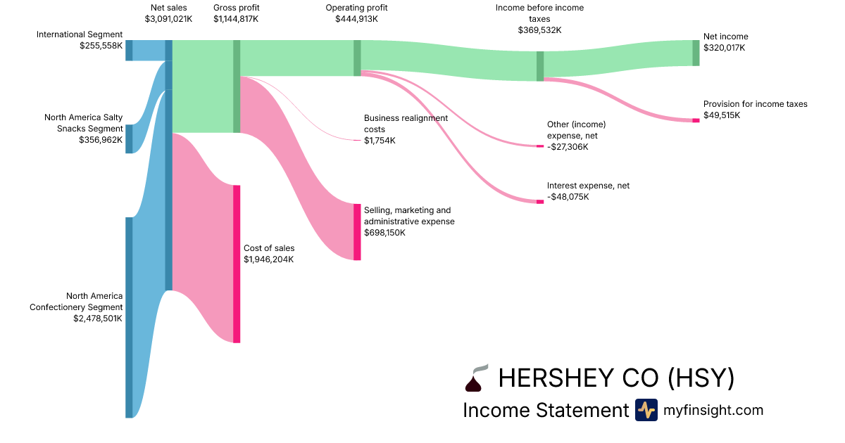 For the year ending 2025-12-31, HSY made $11,692,576K in revenue. $883,259K in net income. Net profit margin of 7.55%.