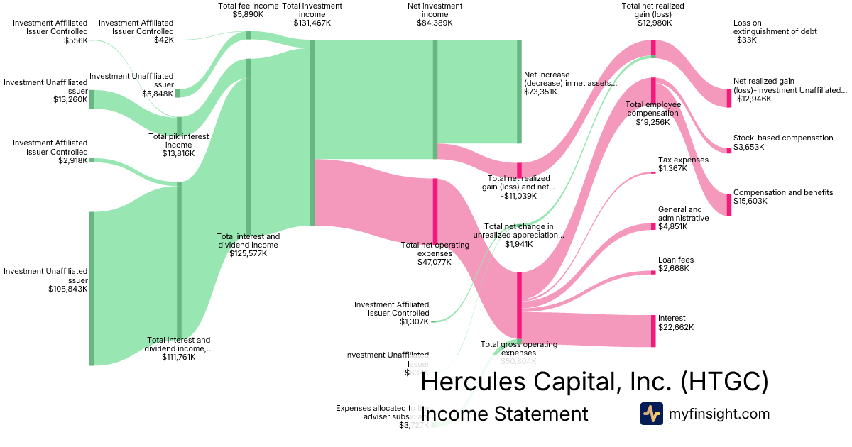 For the year ending 2025-12-31, HTGC made $777,322K in revenue. $339,737K in net income. Net profit margin of 43.71%.