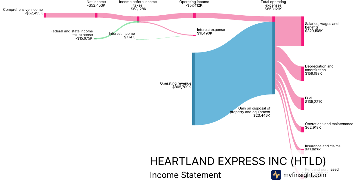 For the year ending 2025-12-31, HTLD made $805,709K in revenue. -$52,453K in net income. Net profit margin of -6.51%.