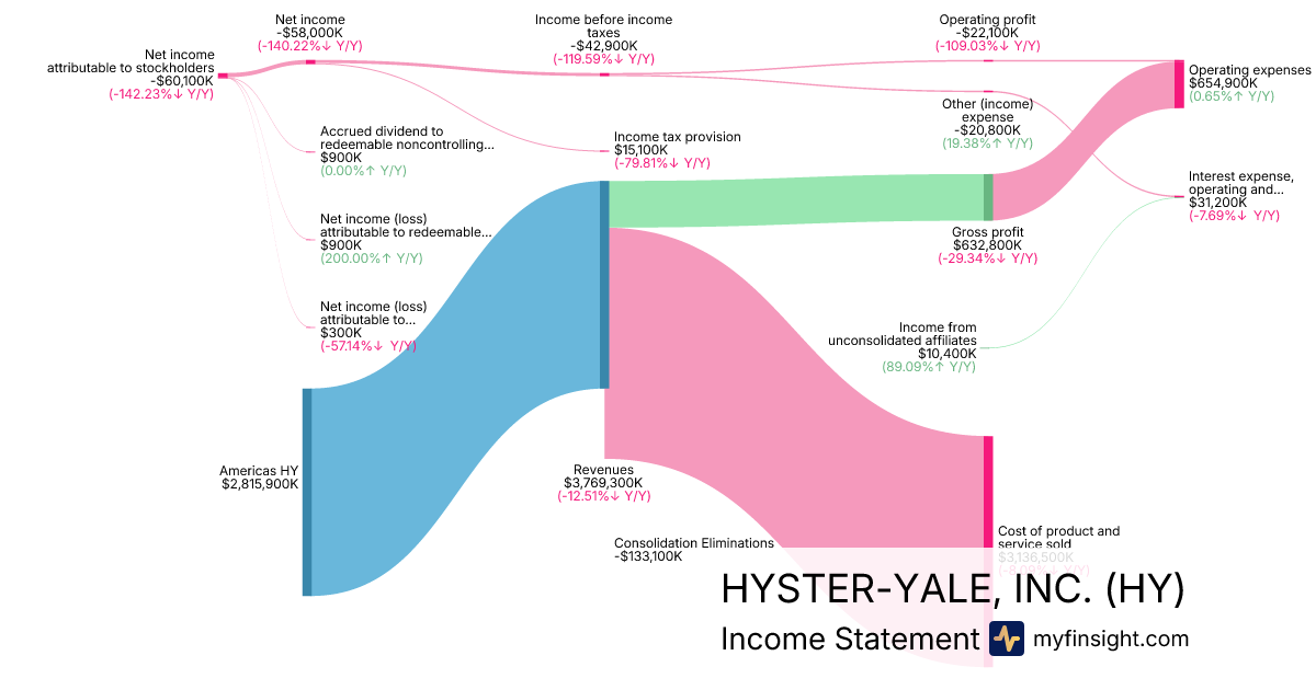 For the year ending 2025-12-31, HY made $3,769,300K in revenue. -$60,100K in net income. Net profit margin of -1.59%.