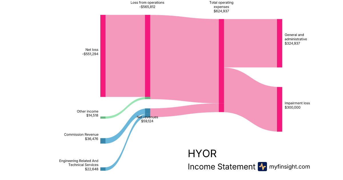 For the year ending 2025-12-31, HYOR made $59,124 in revenue. -$551,294 in net income. Net profit margin of -932.44%.