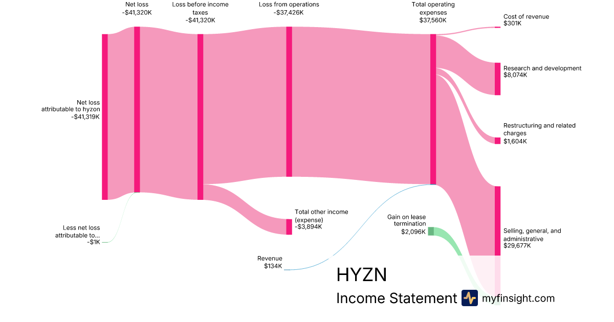 For the quarter ending 2024-09-30, HYZN made $134K in revenue. -$41,319K in net income. Net profit margin of -30835.07%.