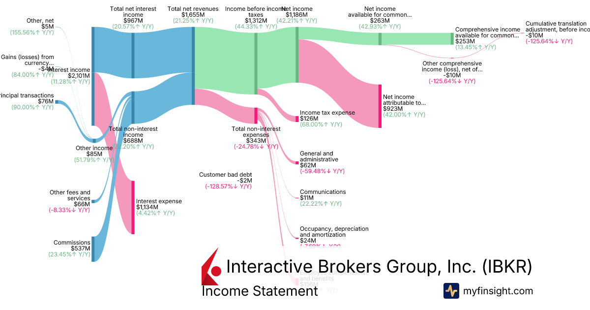 For the quarter ending 2025-09-30, IBKR made $1,655M in revenue. $253M in net income. Net profit margin of 15.29%.