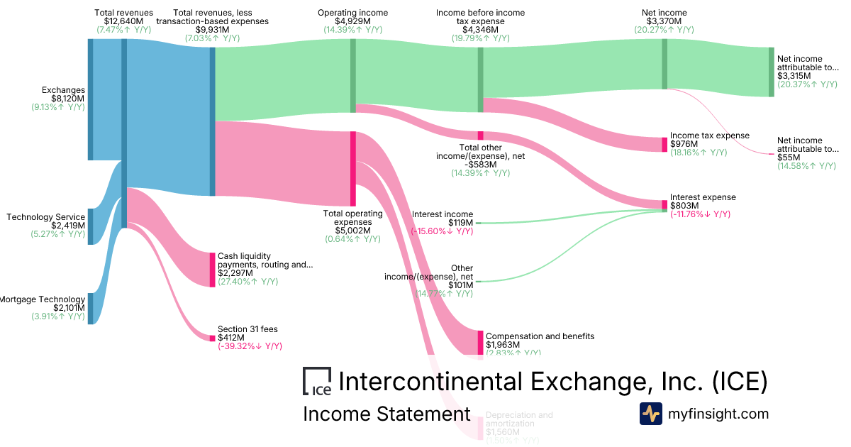 For the year ending 2025-12-31, ICE made $9,931M in revenue. $3,315M in net income. Net profit margin of 33.38%.