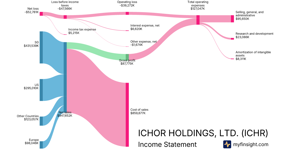 For the year ending 2025-12-26, ICHR made $947,652K in revenue. -$52,781K in net income. Net profit margin of -5.57%.