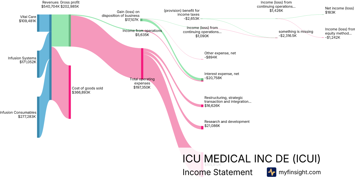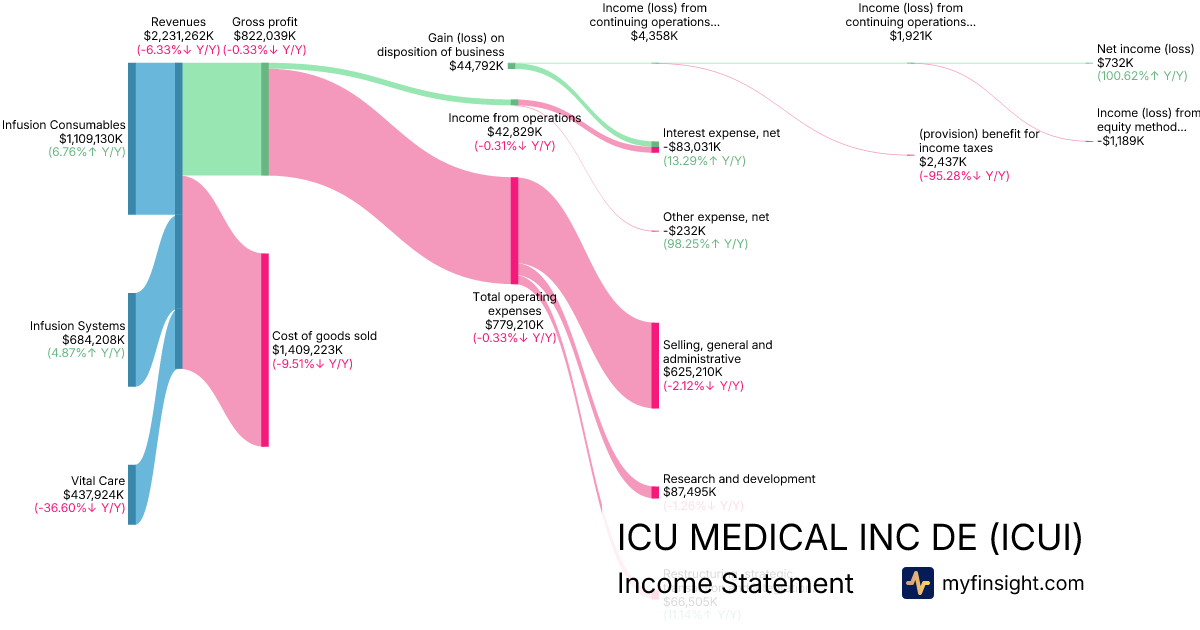 For the year ending 2025-12-31, ICUI made $2,231,262K in revenue. $732K in net income. Net profit margin of 0.03%.
