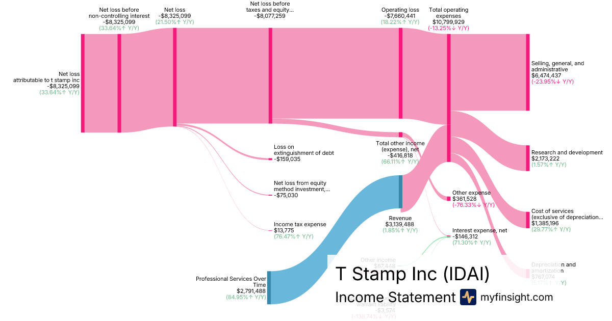 For the year ending 2025-12-31, IDAI made $3,139,488 in revenue. -$8,325,099 in net income. Net profit margin of -265.17%.