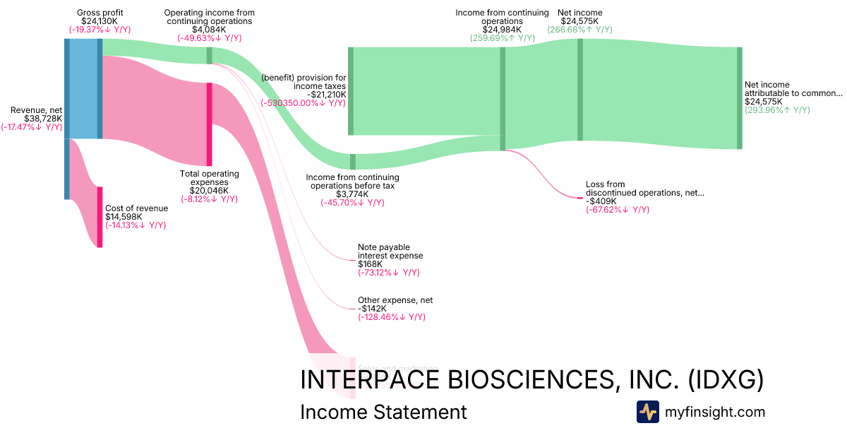 For the year ending 2025-12-31, IDXG made $38,728K in revenue. $24,575K in net income. Net profit margin of 63.46%.