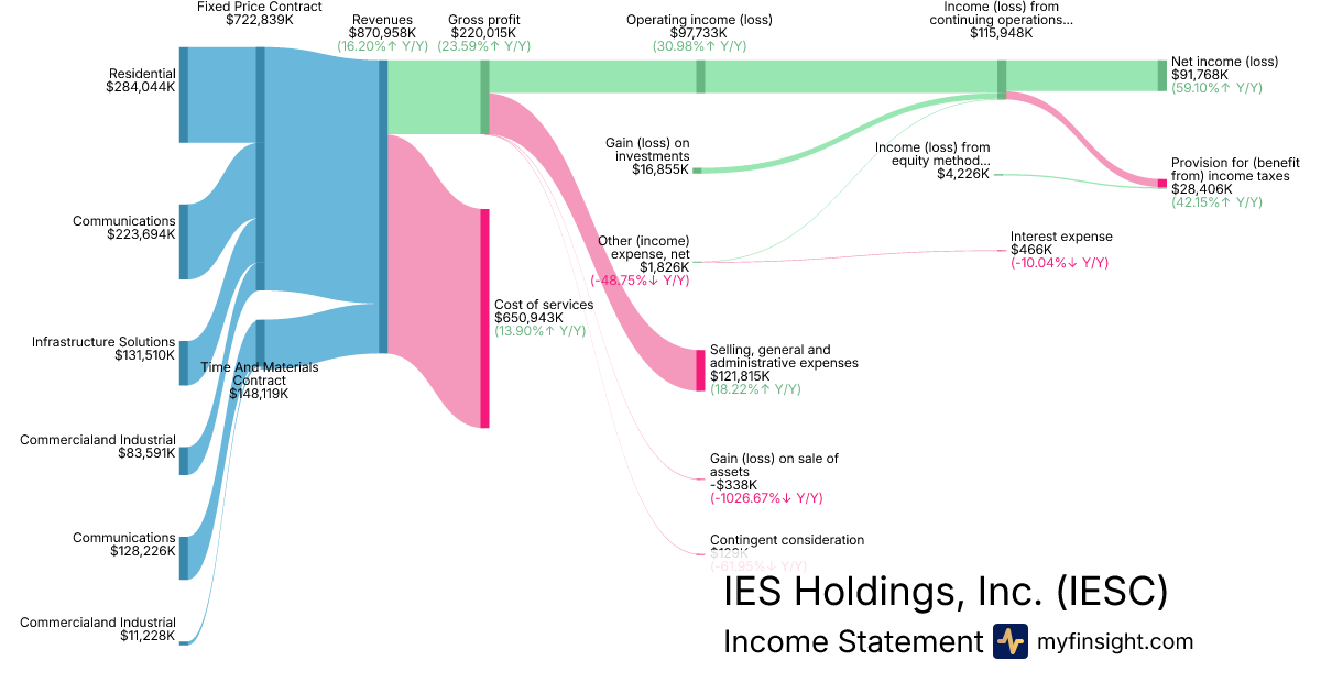 For the quarter ending 2025-12-31, IESC made $870,958K in revenue. $91,768K in net income. Net profit margin of 10.54%.