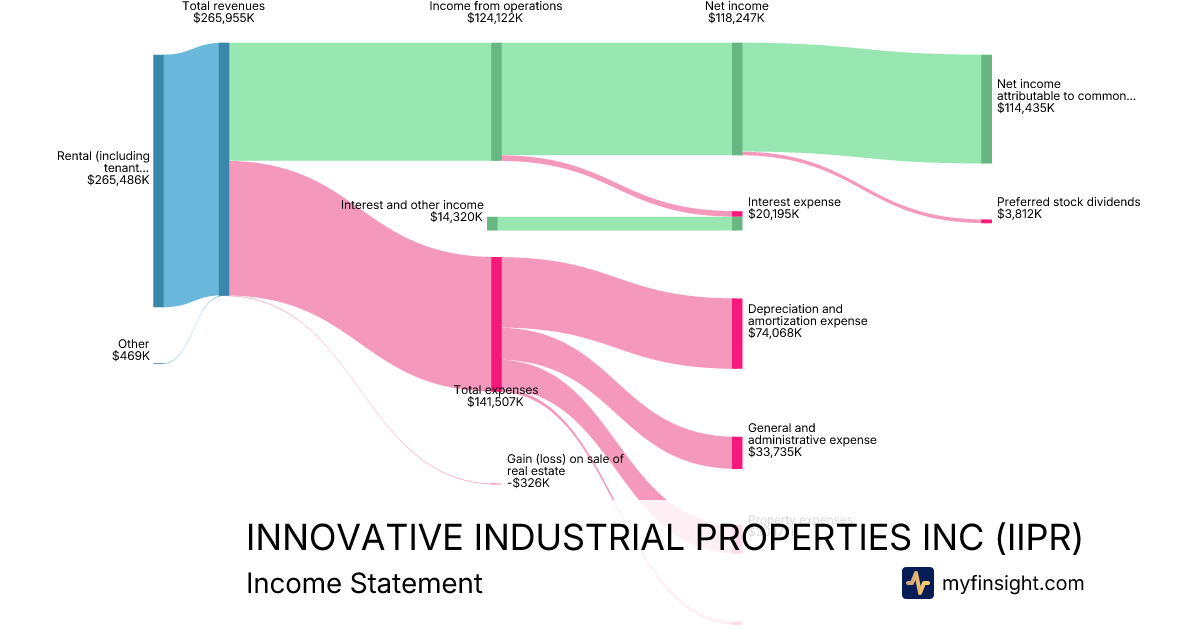 For the year ending 2025-12-31, IIPR made $265,955K in revenue. $114,435K in net income. Net profit margin of 43.03%.