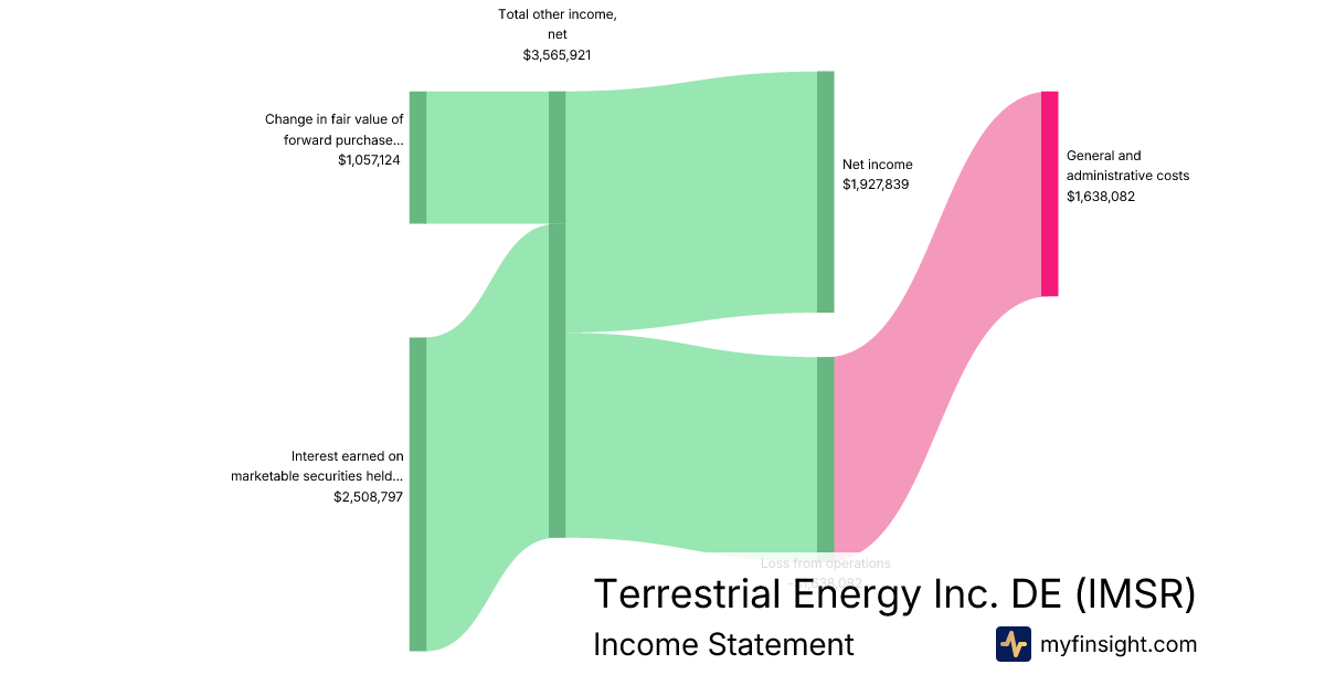 For the quarter ending 2025-09-30, IMSR made $3,565,921 in revenue. $1,927,839 in net income. Net profit margin of 54.06%.