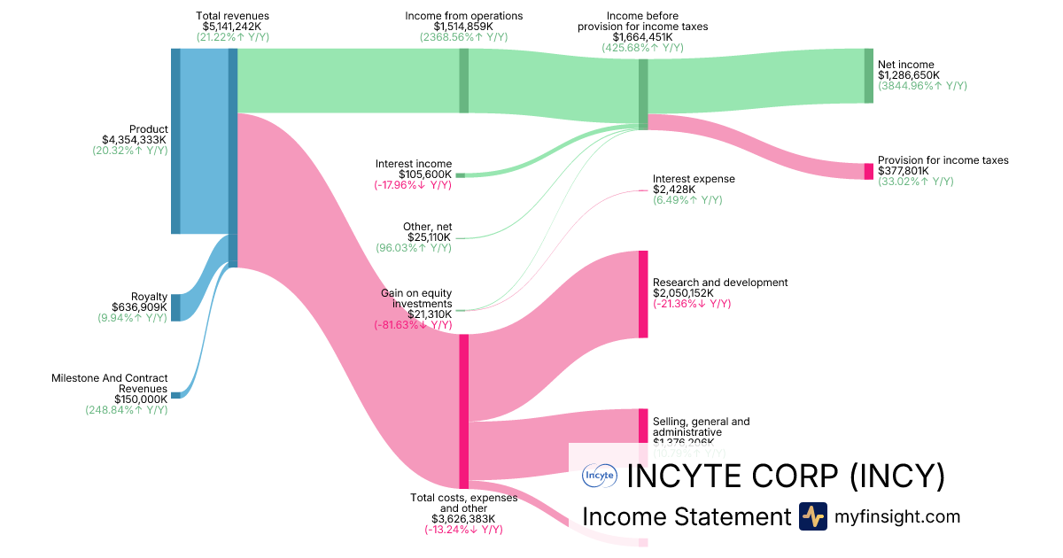 For the year ending 2025-12-31, INCY made $5,141,242K in revenue. $1,286,650K in net income. Net profit margin of 25.03%.