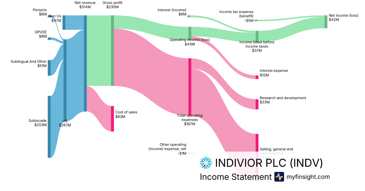 For the quarter ending 2025-09-30, INDV made $314,000K in revenue. $42,000K in net income. Net profit margin of 13.38%.