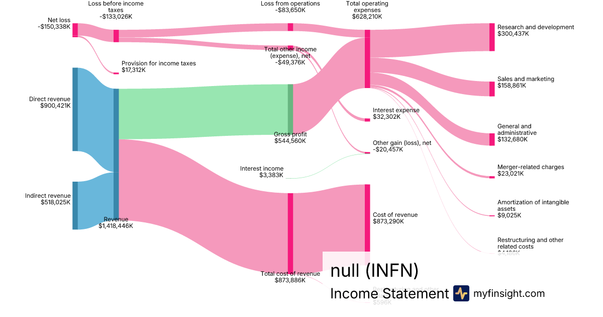 For the year ending 2024-12-28, INFN made $1,418,446K in revenue. -$150,338K in net income. Net profit margin of -10.60%.