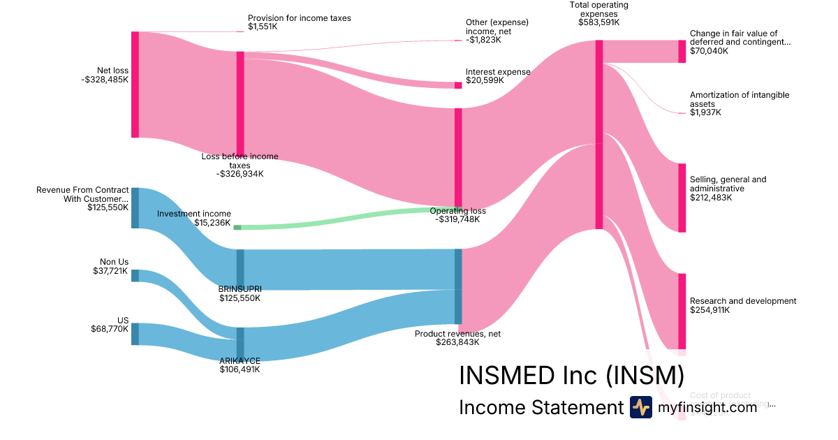 For the year ending 2025-12-31, INSM made $606,423K in revenue. -$1,276,775K in net income. Net profit margin of -210.54%.