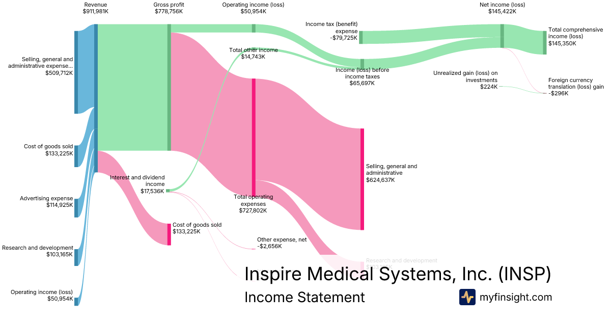 For the year ending 2025-12-31, INSP made $911,981K in revenue. $145,350K in net income. Net profit margin of 15.94%.