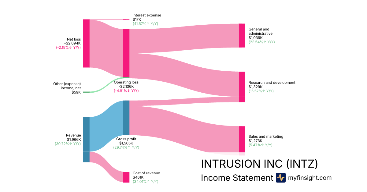 For the quarter ending 2025-09-30, INTZ made $1,966K in revenue. -$2,094K in net income. Net profit margin of -106.51%.