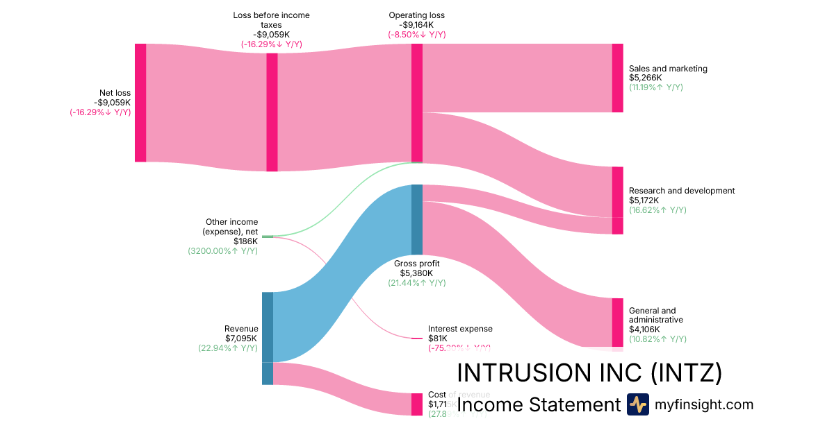 For the year ending 2025-12-31, INTZ made $7,095K in revenue. -$9,059K in net income. Net profit margin of -127.68%.