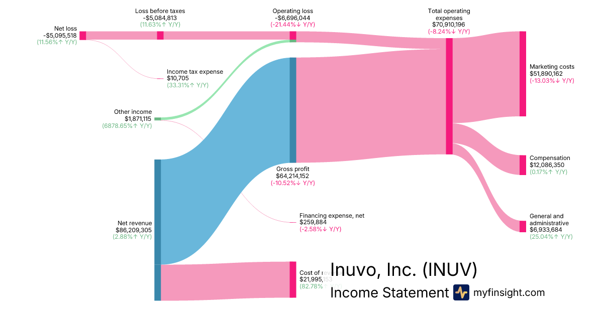For the year ending 2025-12-31, INUV made $86,209,305 in revenue. -$5,095,518 in net income. Net profit margin of -5.91%.