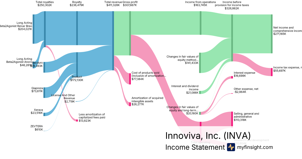 For the year ending 2025-12-31, INVA made $411,328K in revenue. $271,165K in net income. Net profit margin of 65.92%.