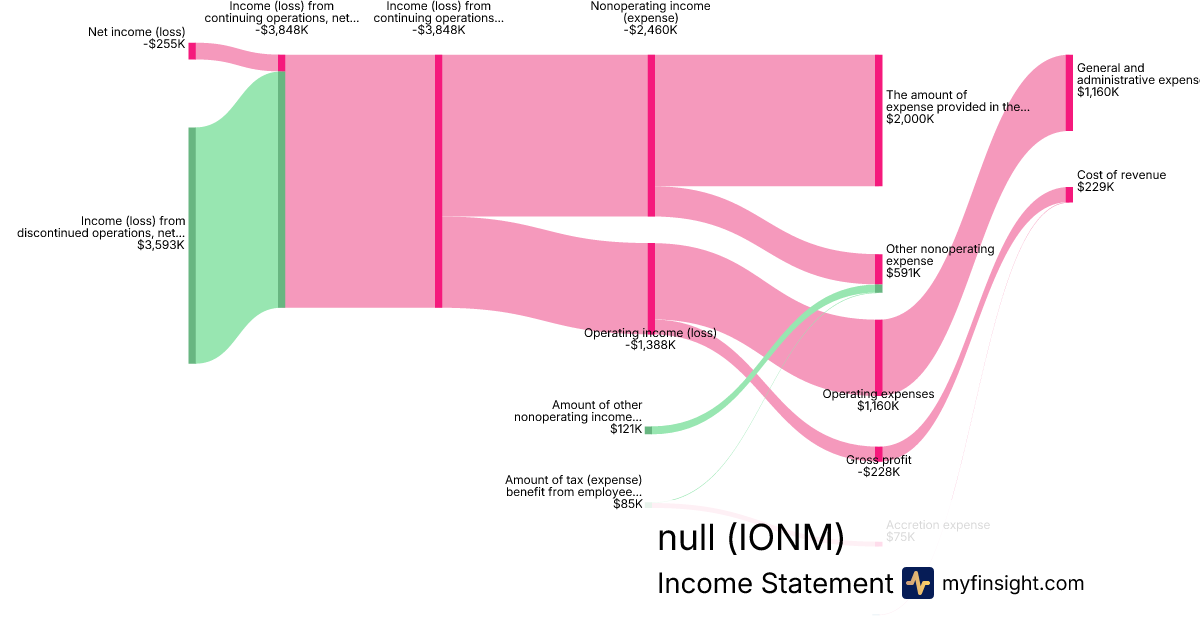 For the quarter ending 2024-06-30, IONM made $1K in revenue. -$255K in net income. Net profit margin of -25500.00%.