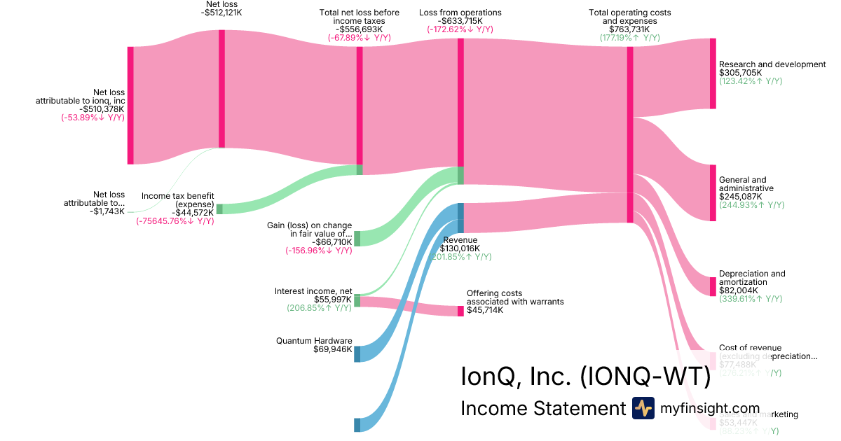 For the year ending 2025-12-31, IONQ-WT made $130,016K in revenue. -$510,378K in net income. Net profit margin of -392.55%.