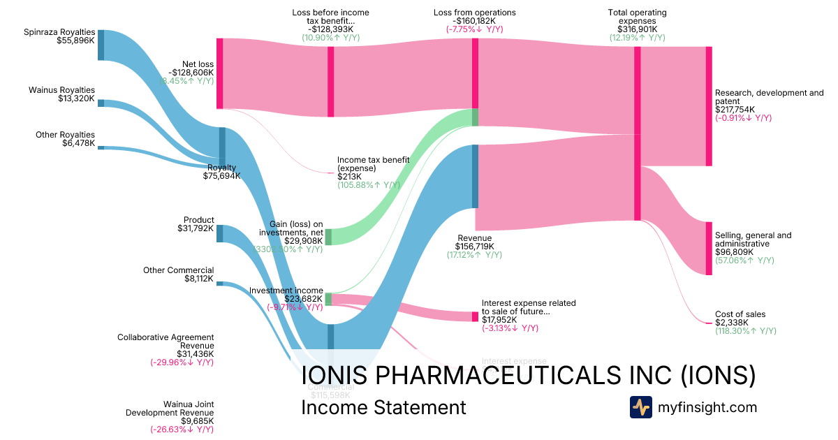 For the quarter ending 2025-09-30, IONS made $156,719K in revenue. -$128,606K in net income. Net profit margin of -82.06%.