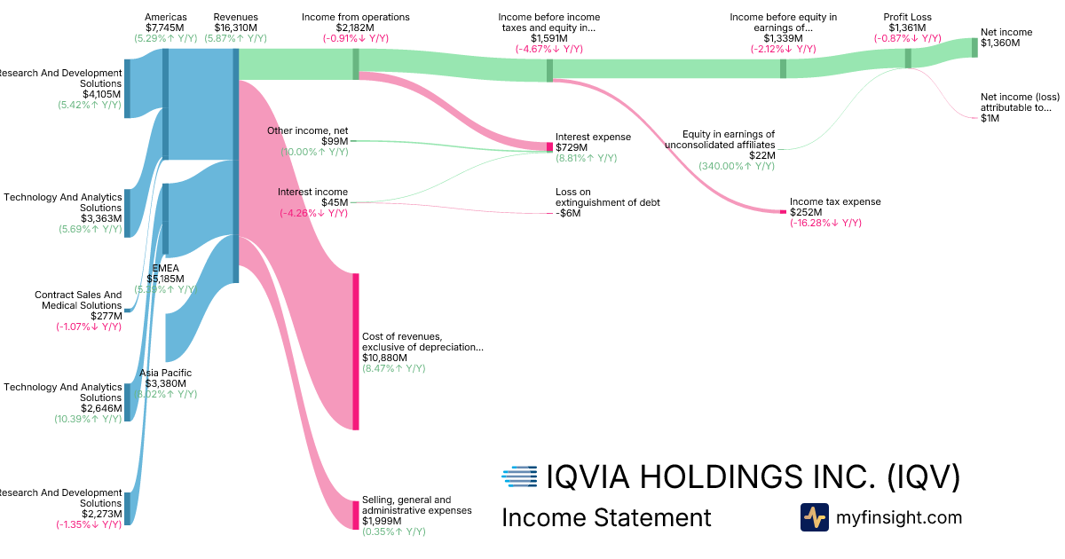 For the year ending 2025-12-31, IQV made $16,310M in revenue. $1,360M in net income. Net profit margin of 8.34%.