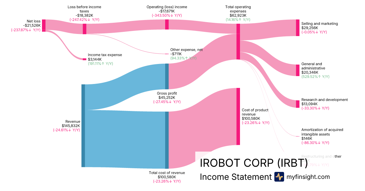For the quarter ending 2025-09-27, IRBT made $145,832K in revenue. -$21,526K in net income. Net profit margin of -14.76%.