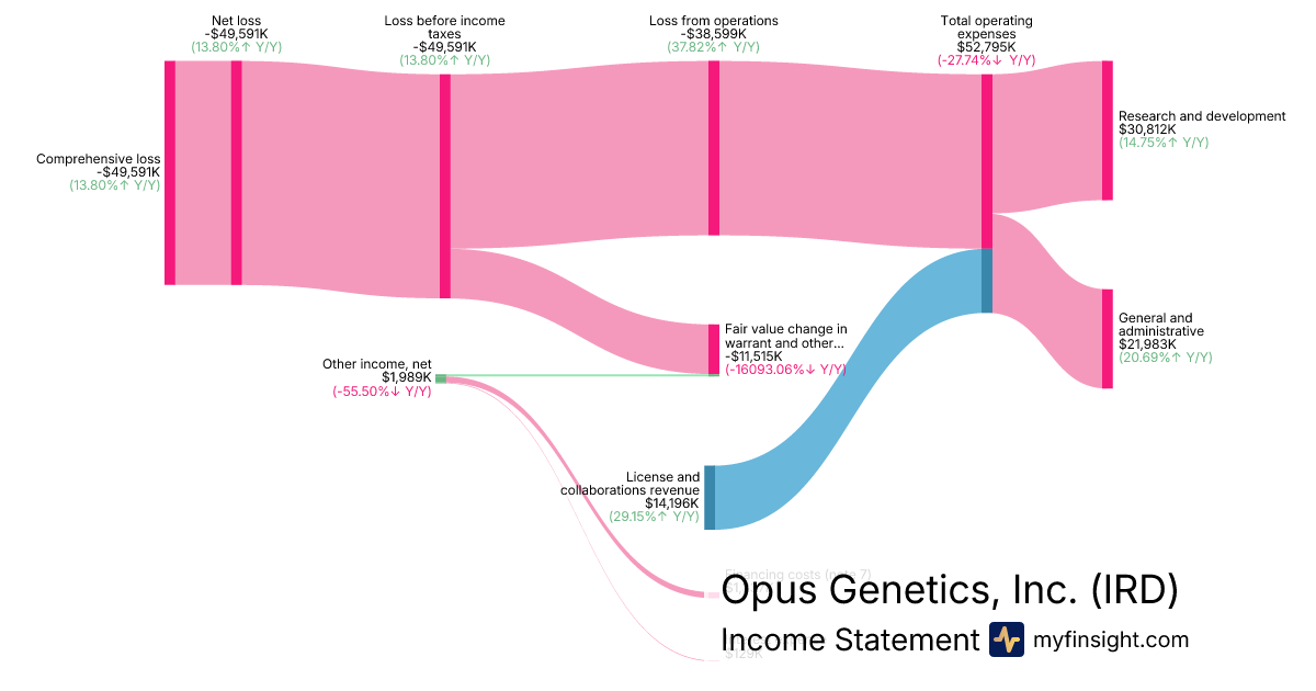 For the year ending 2025-12-31, IRD made $14,196K in revenue. -$49,591K in net income. Net profit margin of -349.33%.