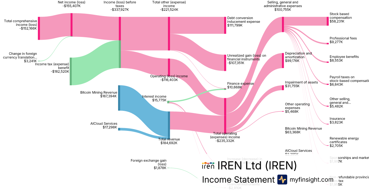 For the quarter ending 2025-12-31, IREN made $184,692K in revenue. -$152,166K in net income. Net profit margin of -82.39%.