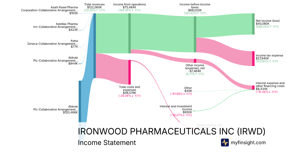 For the quarter ending 2025-09-30, IRWD made $122,060,000 in revenue. $40,080,000 in net income. Net profit margin of 32.84%.