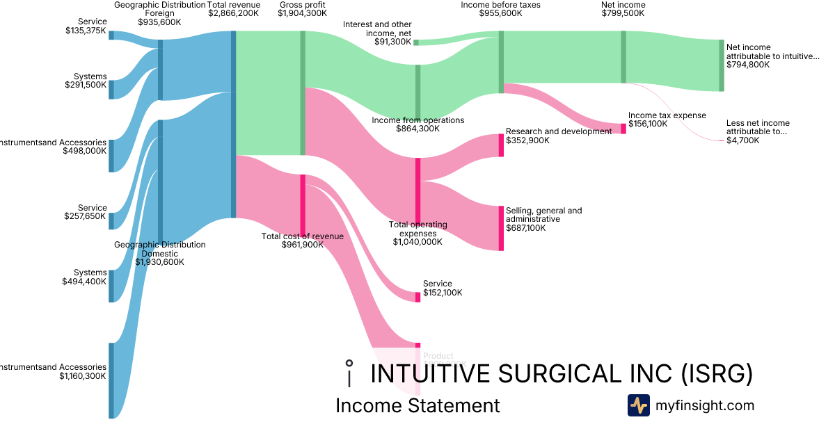 For the year ending 2025-12-31, ISRG made $10,064,700K in revenue. $2,856,000K in net income. Net profit margin of 28.38%.