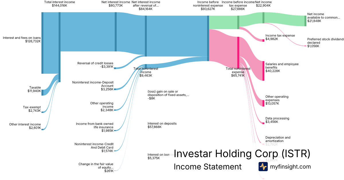 For the year ending 2025-12-31, ISTR made $93,627K in revenue. $21,848K in net income. Net profit margin of 23.34%.