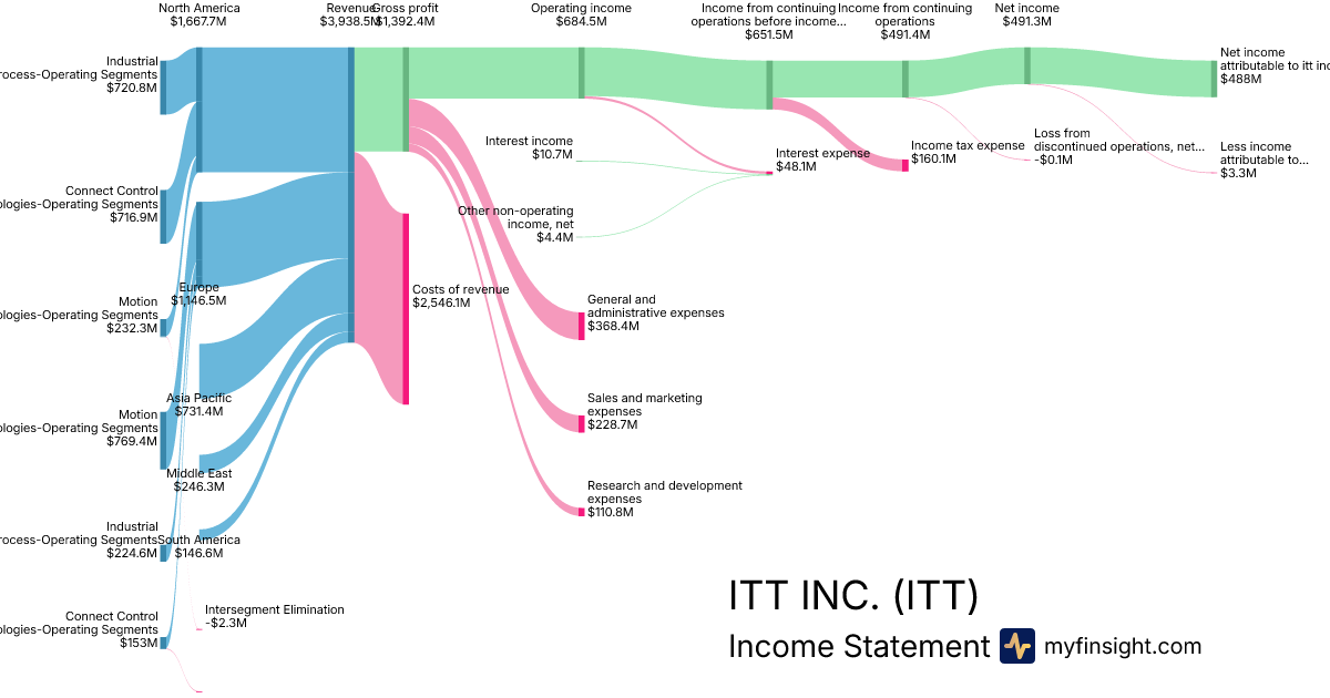 For the year ending 2025-12-31, ITT made $3,938.5M in revenue. $488M in net income. Net profit margin of 12.39%.