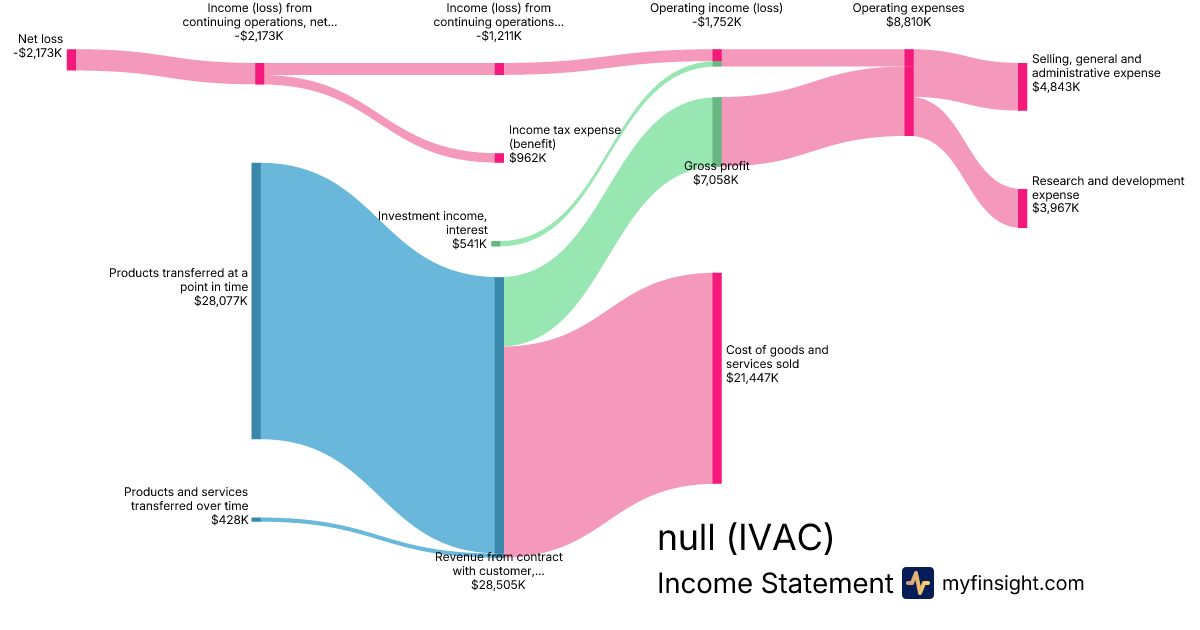 For the quarter ending 2024-09-28, IVAC made $28,505K in revenue. -$2,173K in net income. Net profit margin of -7.62%.