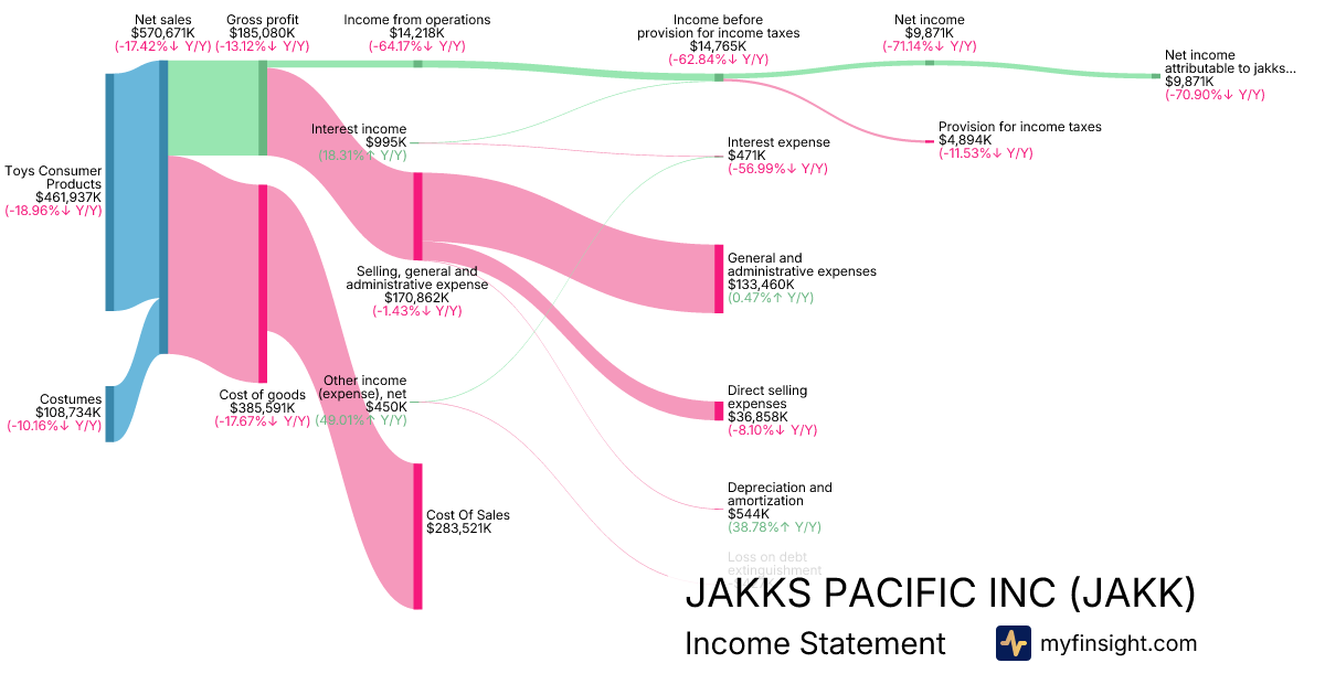 For the year ending 2025-12-31, JAKK made $570,671K in revenue. $9,871K in net income. Net profit margin of 1.73%.