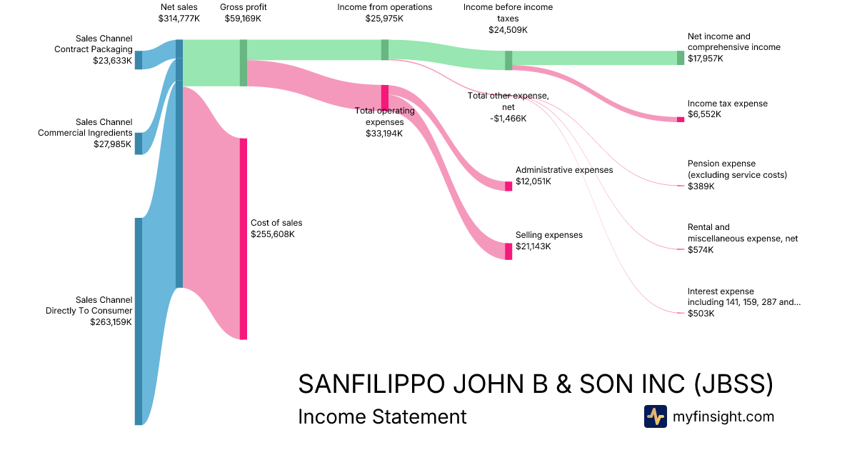 For the quarter ending 2025-12-25, JBSS made $314,777K in revenue. $17,957K in net income. Net profit margin of 5.70%.