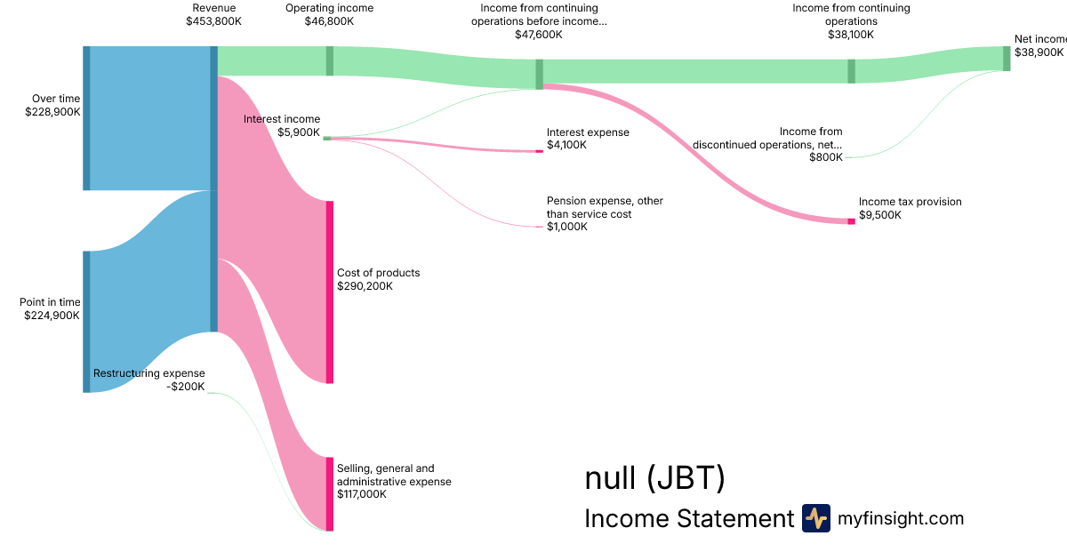 For the quarter ending 2024-09-30, JBT made $453,800K in revenue. $38,900K in net income. Net profit margin of 8.57%.