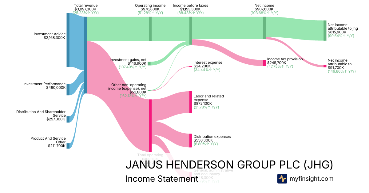 For the year ending 2025-12-31, JHG made $3,097,300K in revenue. $815,900K in net income. Net profit margin of 26.34%.