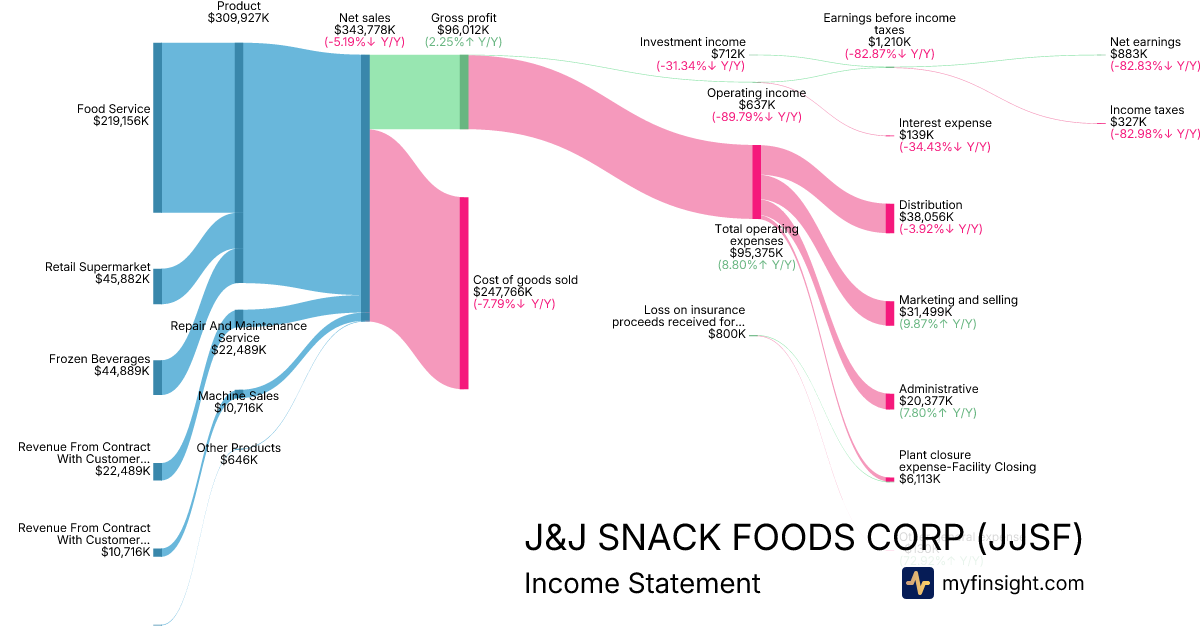 For the quarter ending 2025-12-27, JJSF made $343,778K in revenue. $883K in net income. Net profit margin of 0.26%.