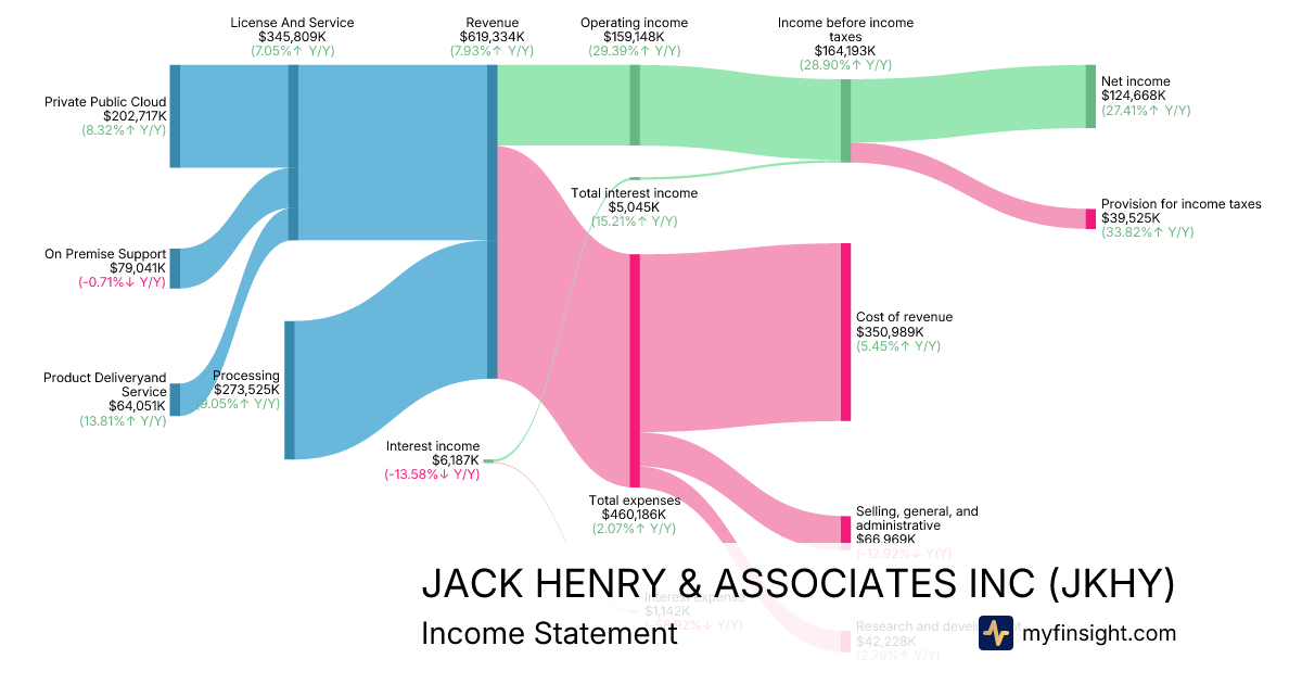 For the quarter ending 2025-12-31, JKHY made $619,334K in revenue. $124,668K in net income. Net profit margin of 20.13%.