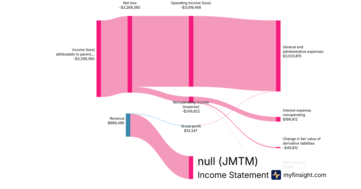 For the quarter ending 2024-09-30, JMTM made $989,486 in revenue. -$3,269,390 in net income. Net profit margin of -330.41%.