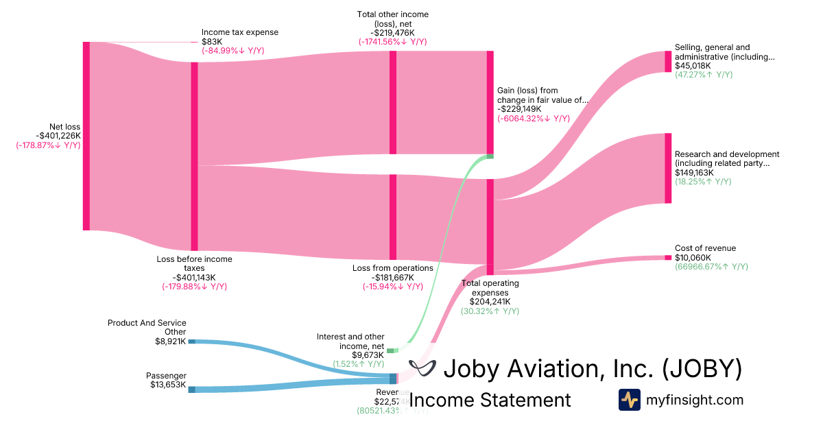 For the quarter ending 2025-09-30, JOBY made $22,574K in revenue. -$401,226K in net income. Net profit margin of -1777.38%.