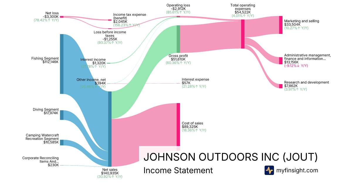 For the quarter ending 2026-01-02, JOUT made $140,935K in revenue. -$3,300K in net income. Net profit margin of -2.34%.